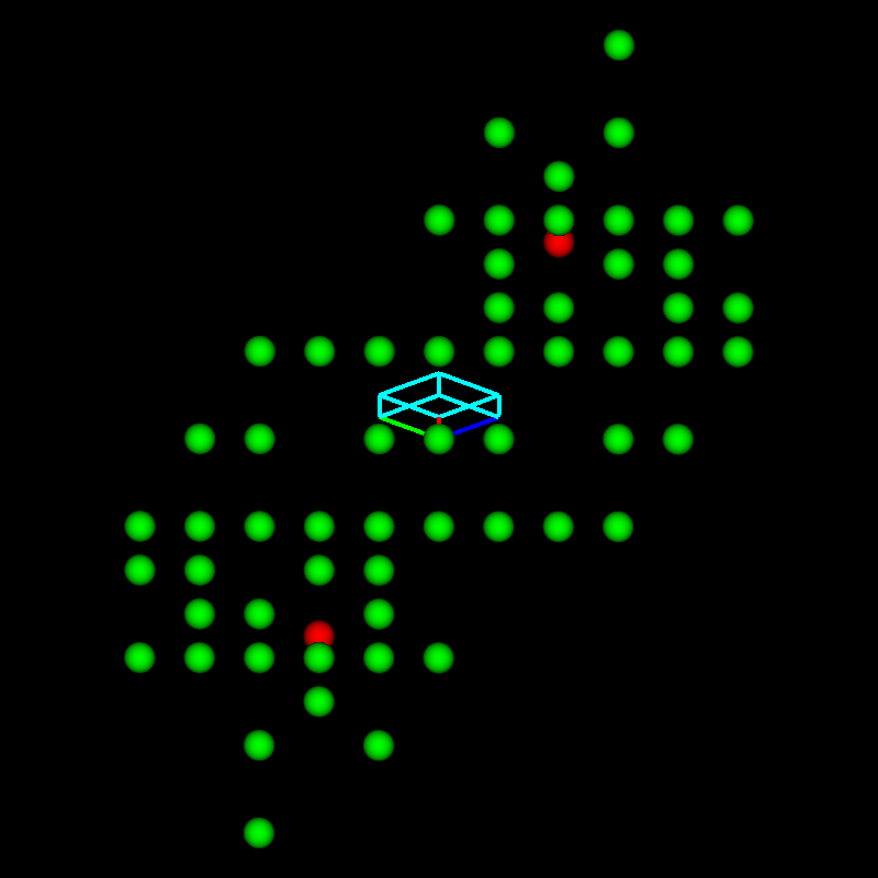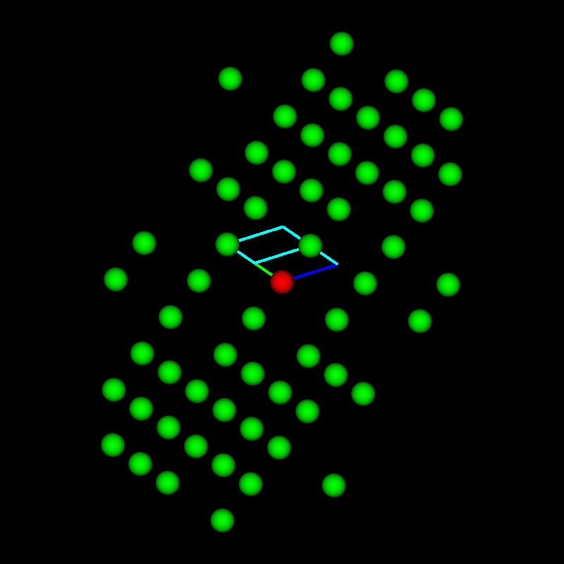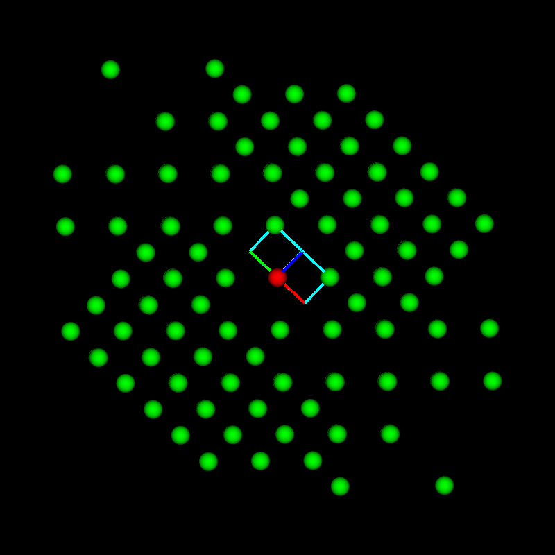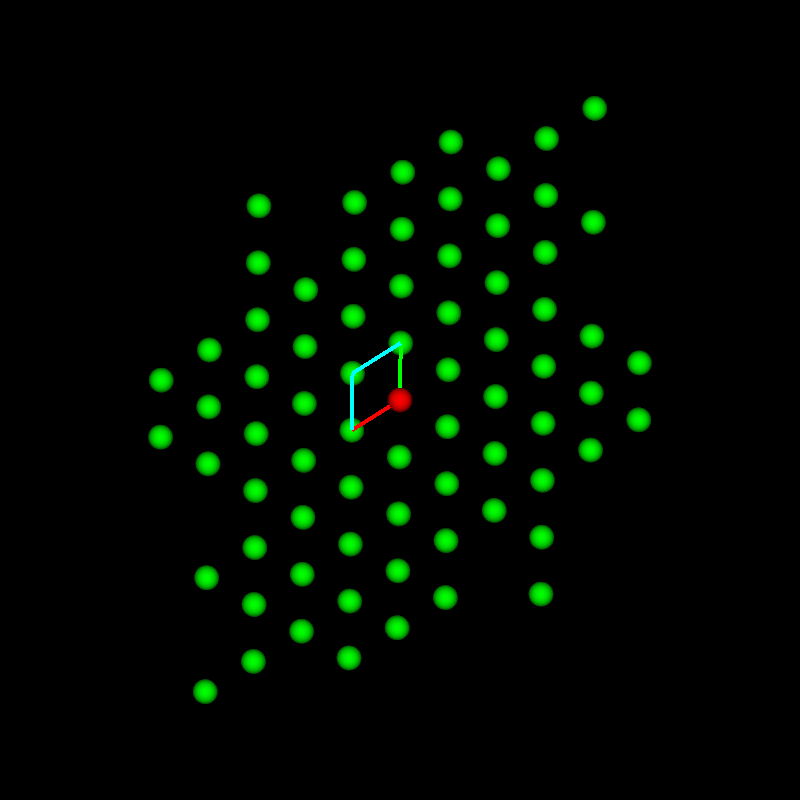 Projection of the reciprocal lattice derived from a hematite pattern. From 66 bands 132+1=66*2+1 reciprocal lattice points are derived which deliver a cube-like lattice description (α=85.9°). Adding only the light-red colored lattice point, the reciprocal lattice is given by a unit cell with (α=55.4°).