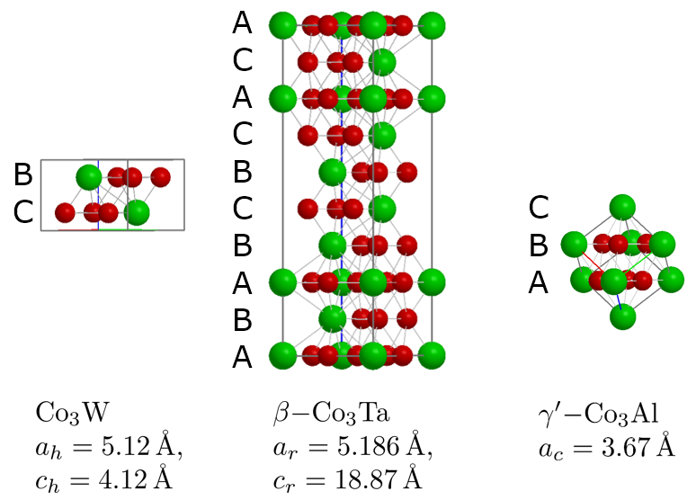 This fits perfectly with the next example, which is from a Co-based alloy containing W. A Co-W phase occurred in a eutectic region for which no equivalent was found in any of the databases. By expanding the search to only Co-containing phases, a candidate was found that had striking similarities: β-Co3Ta. It consists of nine Co3Ta-layers with the stacking sequence ABABCBCAC. the structure is shown in the next image together with the known but not matching hexagonal phase Co3W and the cubic γ’-phase shown in the BSE images (a) below as grid-like feature embedded in the dark matrix phase.