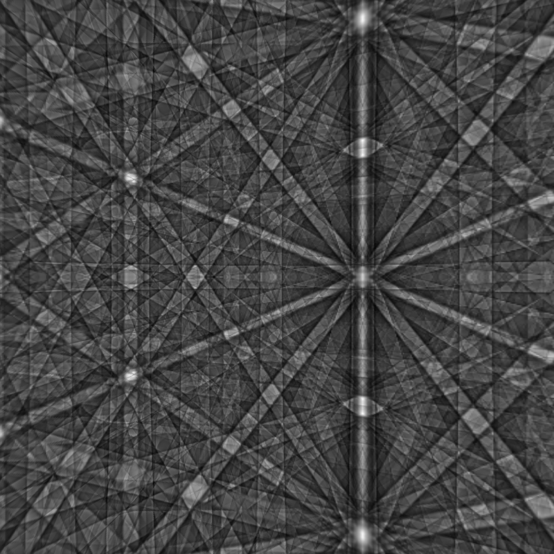 For example, the images below show the already rotated signal of a dynamical simulation (digital twin) of anhydite (CaSO4) as stereographic projection (left). Next to it is the resulting gnomonic projection of the signal for the applied rotation and the fixed PC, while on the right is shown the reciprocal lattice derived from the Kikuchi pattern thus generated. All these representations, including the Funk transformation not shown here, are freely rotatable by moving the mouse while holding down the left mouse button (LMB).